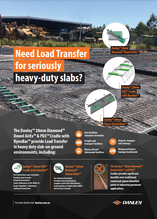 | Danley Heavy Duty Load Transfer Flyer | Brochures & Flyers | The Danley™ 20mm Diamond™ Dowel AireX & PD3™ Cradle with RynoBar™ provide Load Transfer in heavy duty slab-on-ground environments. |